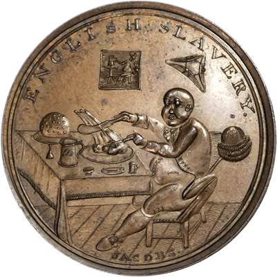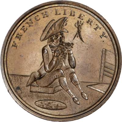 London - Holborn, Thomas Spence Halfpenny undated, A fat Englishman tucking into rib of beef with plum pudding to follow, rev. A thin Frenchman eating a plate of frogs’ legs with a guillotine to right edge plain, 29.5mm/13gm. (DH 760). Good Extremely Fine, beautifully evenly toned with underlying brilliance, superb and rare.