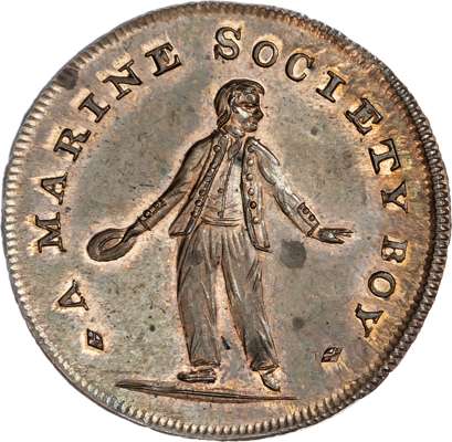 London - Holborn, Thomas Spence Halfpenny undated, A Marine Society boy standing, holding hat, rev. A sailor standing, smoking and holding out a begging bowl, edge plain, 28.5mm/10.57gm. (DH 783). Good Extremely Fine with considerable amounts of original lustre making a warm glow, rare.