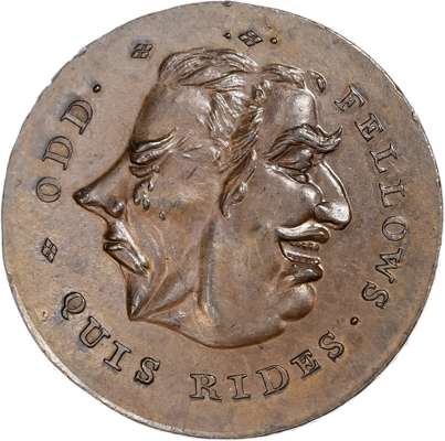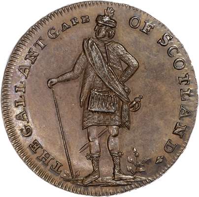London - Holborn, Thomas Spence Halfpenny 1795, Heads of Pitt frowning and Fox laughing, conjoined, rev. A Highlander standing in national dress (kilt), edge SPENCE DEALER x IN x COINS x LONDON x, 29mm/12.71gm. (DH 806). Well struck. good Extremely Fine with good even toning, rare.