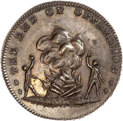 London - Holborn, Thomas Spence Halfpenny undated, Two men standing and cheering a pile of land titles and deeds going up in flames, rev. Caduceus within 6-line legend edge SPENCE DEALER x IN x COINS x LONDON x, 30.25mm/11.9gm. (DH 820). Well struck, good Extremely Fine and handsomely toned with underlying brilliance, scarce.