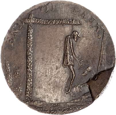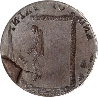 Birmingham (listed under London by D&H), John Hancock with John Jorden brockage Halfpenny undated, A man (Thomas Paine) hanging from a gibbet, rev. incuse impression of previous, edge plain, 27.55mm/10.43gm. (DH 825 bis). Good Extremely Fine with an almost bronze-like toning, Unique !