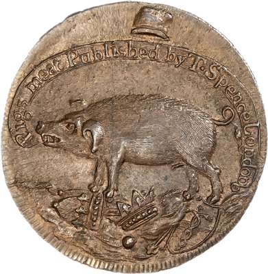 London - Holborn, Thomas Spence Halfpenny undated, A boar standing left advertising ‘Pig’s meat’, trampling on emblems of popery and royalty rev. Heart in hand in olive wreath, edge plain. 29mm/10.42 gm. (DH 845), well struck, good Extremely Fine neatly toned with some lustre, scarce.