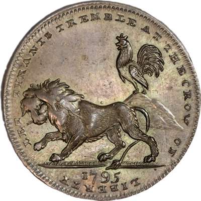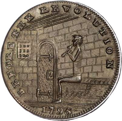 London - Holborn, Thomas Spence Halfpenny 1795, A man shackled sitting in gaol, gnawing on a bone, rev. A cock crowing over a skulking lion, edge plain, 28.75mm/10.75gm. (DH 852a). Rev. a little weakly struck otherwise good Extremely Fine, toned with just a hint of lustre, very rare, ‘RR’.