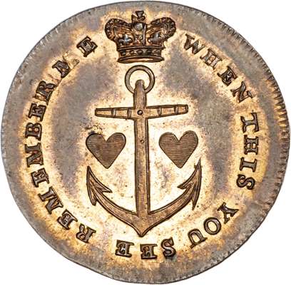 London - Holborn, Thomas Spence Halfpenny undated, A sailor standing smoking, holding out a begging bowl, rev. A crowned anchor between two hearts, edge, SPENCE DEALER x IN x COINS x LONDON x, 29.5mm/10.13gm. (DH 857). Well struck, good Extremely Fine with almost full original mint lustre, scarce and superb.
