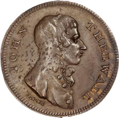 London - Holborn, Thomas Spence Halfpenny undated, Draped bust right of the radical John Thelwall, rev. Minerva standing holding Cap of Liberty and Shield of Justice edge, plain, 30mm/13.35gm. (DH 866). Obv. die rusty ‑ resulting in pitting and weakly struck, reverse weak, otherwise good Extremely Fine, toned with trace of lustre, very rare ‘RR’.