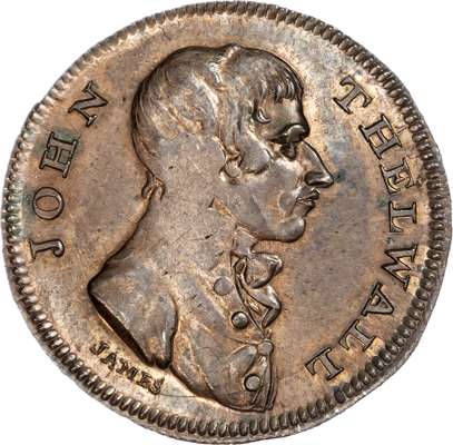 London - Holborn, Thomas Spence Halfpenny undated, Draped bust right of the radical John Thelwall, rev. Façade of Old Bailey Justice, edge, plain, 30mm/10.54gm. (DH 868). A little weakly struck with a die crack beginning on the rev., otherwise good Extremely Fine with considerable amounts of original mint lustre, scarce.