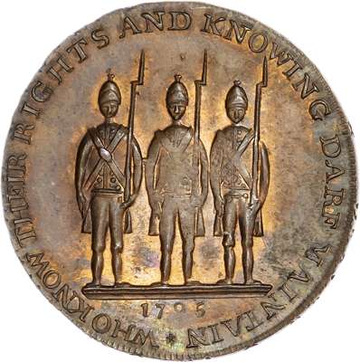 London - Holborn, Thomas Spence Halfpenny undated, Draped bust right of the radical John Thelwall, rev. Three fusiliers standing in a row, edge, SPENCE DEALER x IN x COINS x LONDON x, 29.5mm/8.91gm. (DH 875). Reverse little weakly struck, otherwise, good Extremely Fine with almost full original mint lustre, scarce.
