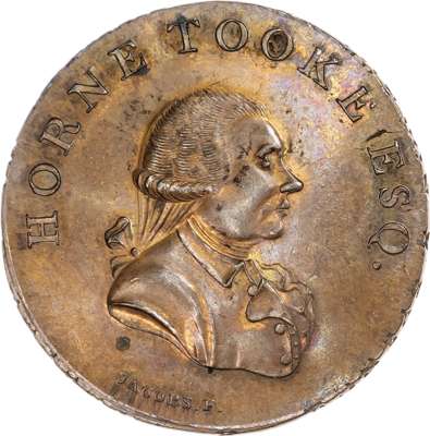 London - Holborn, Thomas Spence Halfpenny undated, Draped bust right of the democrat John Horne-Tooke, rev. Heart in hand in olive wreath, edge, SPENCE DEALER x IN x COINS x LONDON x, 29.25mm/10.74gm. (DH 876). Well struck and good Extremely Fine with a lot of original mint lustre and some iridescence, rare.