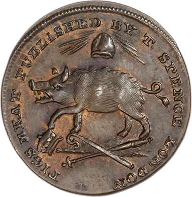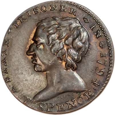 London - Holborn, Thomas Spence Farthing 1794, His bare bust left, rev. Britannia seated losing Cap of Liberty, edge plain, 21.25mm/3.64gm. (DH 1077). Another but rev. a padlock, 20.5mm/4.09gm. (DH 1080). Another but pig trampling emblems of royalty, 20.25mm/4.12gm. (DH 1081). All three good Extremely Fine and toned with some lustre on each, especially first, last two rare. [3]