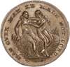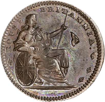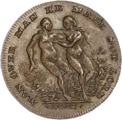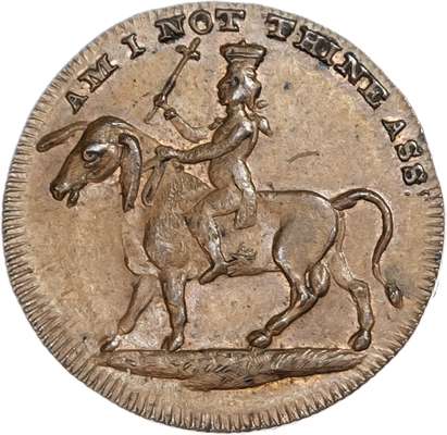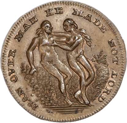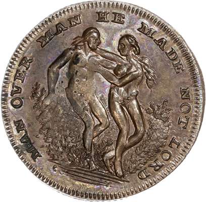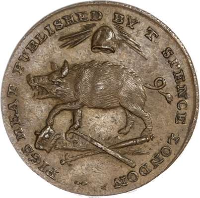 London - Holborn, Thomas Spence Farthing undated, Adam & Eve seated on a bank, naked, rev. pig trampling emblems of royalty, edge plain, 20.mm/3.77gm. (DH 1083). Another but rev. Britannia seated losing Cap of Liberty, 21mm/3.13gm. (DH 1084). Another but rev. George III riding an ass, 21mm/3.15gm. (DH 1085). First struck from rusty dies, otherwise Extremely Fine and toned, other two good Extremely Fine with reflection ‑ especially DH 1084. [3]