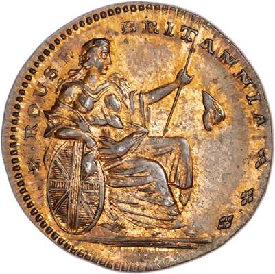 London - Holborn, Thomas Spence Farthing undated, Janiform heads of prime-minister Pitt (one leering satanically, one smiling deceptively !), rev. Britannia Seated left, losing Cap of Liberty, edge plain, 20.5mm/4.03gm. (DH 1092). Good Extremely Fine with full blazing mint lustre, superb and rare.