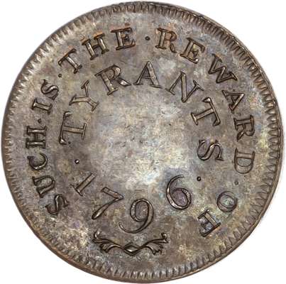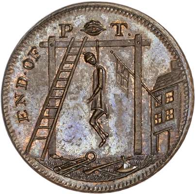 London - Holborn, Thomas Spence Farthing 1796, A man hanging from a gibbet, items of torture below (aping the ‘End of Pain’ types - but in this case it is Pitt who is hanged), rev. 2-line circular legend re. tyrants, edge plain, 21mm/3.75gm. (DH 1111a). Good Extremely Fine prettily toned with much iridescence and a trace of original lustre, superb and rare.