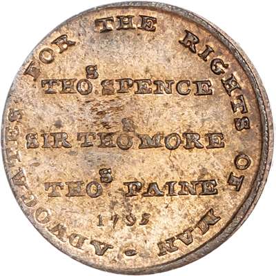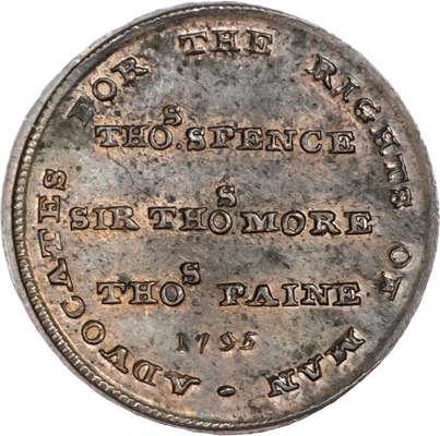 London - Holborn, Thomas Spence Farthing 1795, THOS SPENCE / SIR THOS MORE / THOS PAINE rev. Britannia Seated left, losing Cap of Liberty, edge plain, 21mm/3.56gm. DH 1113). Another but rev. a pig trampling emblems of royalty, 20.5mm/3.18gm. (DH 1117). Both good Extremely Fine, first toned with trace of lustre, second with full blazing mint lustre. [2]