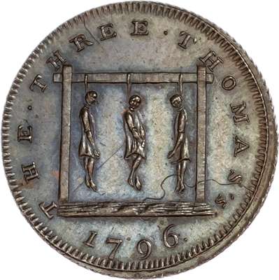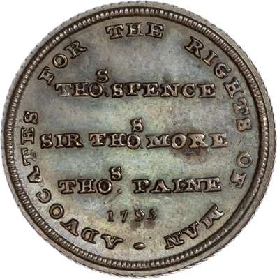 London - Holborn, Skidmore Farthing 1795/6, THOS SPENCE / SIR THOS MORE / THOS PAINE rev. The three Thomas’ hanging from a gibbet, edge diagonally milled, 21.25mm/3.76gm. (DH 1119). Good Extremely Fine, toned with handsome blueish iridescence, very rare.
