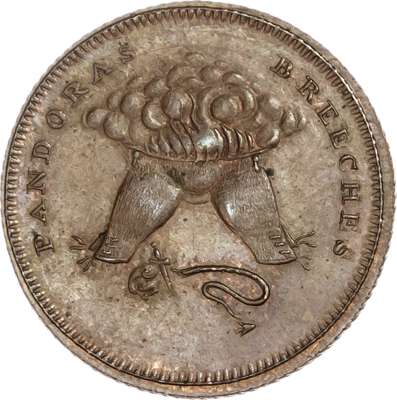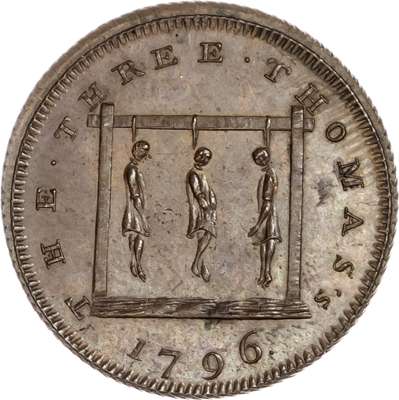 London - Holborn, Skidmore Farthing 1796, The three Thomas’ hanging from a gibbet, rev. pair of breeches on fire, decapitated snake below (with George III’s head), edge diagonally milled, 21.75mm/3.72gm. (DH 1121). Extremely Fine, toned with some brilliance and a trace of lustre, very rare ‘RR’.