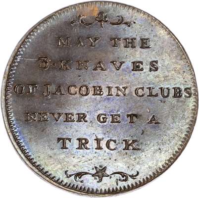 London - Holborn, Skidmore Farthing 1796, The three Thomas’ hanging from a gibbet, rev. 5-line legend re. the 3 knaves, edge plain, 21mm/3.84gm. (DH 1123a). Good Extremely Fine, toned with much brilliance and handsome iridescence, rare.