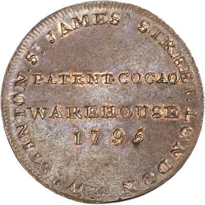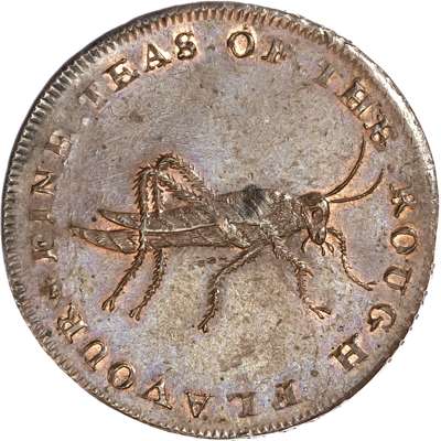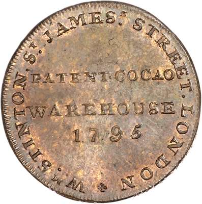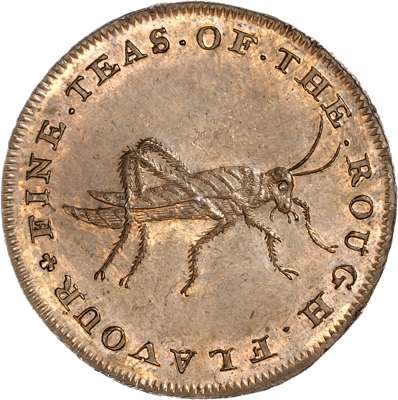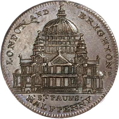 London - Blackfriars, James Spittle, John Kirby & Richard Lathmar (cheesemonger / grocer / banker) Halfpenny 1795, St. Paul’s Cathedral, rev. Arms of Brighton, edge plain, Britannia seated losing Cap of Liberty 28.5mm/10.34gm. (DH 902). Another but with ‘ST PAUL’S’ added in exergue of Obv, 28.5mm/9.81gm. (DH 903). London - St. James St. William Stinton (grocer & tea-dealer) Halfpenny 1795, A grasshopper (name of his shop), rev. 3-line legend, edge ITALIAN FRENCH & PORTUGAL FRUIT WAREHOUSE, 28.25mm/9.04gm. (DH 904) Another but edge PAYABLE IN DUBLIN OR LONDON, 29mm/9.27gm. (DH 904a) All good Extremely Fine, first with substantial amounts of original lustre, second toned, third iridescent with traces of lustre, fourth with more lustre and scarce. [4]