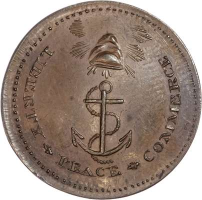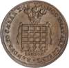 London - St. Martin’s Lane, William Williams, Prattent’s mule Halfpenny undated, cap of Liberty over cable & anchor, rev. Prince of Wales plumes over portcullis, edge plain, 30.75mm/10.62gm. (DH 919). Struck on a large flan and good Extremely Fine with reflective choc‑brown toning, rare.