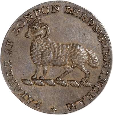 London, Leeds & Middlesex, Unknown Issuer Halfpenny, Ram crest, rev. Crowned lion’s head crest, edge plain, 27mm/8.07gm. (DH 927). Extremely Fine, nicely toned, uncommon.