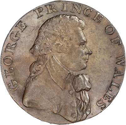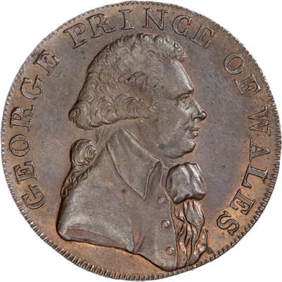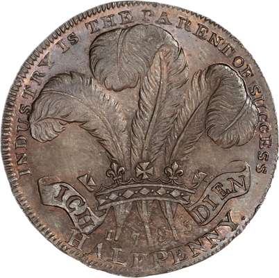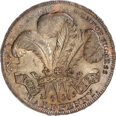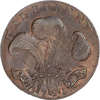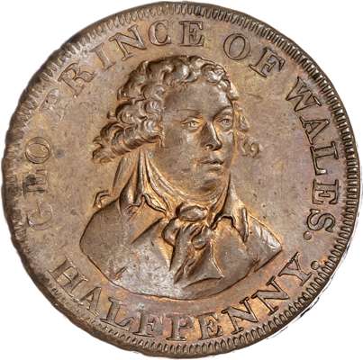 London National Series, Prince of Wales Halfpenny 1795, Draped bust of prince, half facing right, rev. Prince of Wales plumes and motto, edge PAYABLE IN LANCASTER LONDON OR BRISTOL, 29mm/9.44gm. (DH 961). Another but obv. his draped bust right, 28.25mm/9.25gm. (DH 962). Another the same but edge PAYABLE AT LONDON, 28mm/8.96gm. (DH 962a). Another similar but denomination now above plumes on rev., edge PAYABLE AT LONDON LIVERPOOL OR BRISTOL, 28.75mm/8.67gm. (DH 963). All good Extremely Fine, some original colour and iridescences in all ‑ especially first and last. [4]