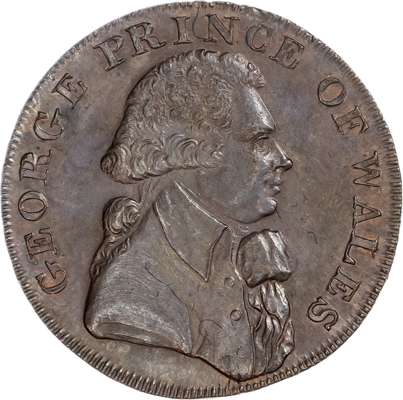 London National Series, Prince of Wales Halfpenny 1795, Draped bust of prince right, rev. `Prince of Wales plumes and motto, edge plain, 28.5mm/9.36gm. (DH 963b). Another similar but with a period after halfpenny, edge PAYABLE AT LONDON LIVERPOOL OR BRISTOL, 29.5mm/9.46gm. (DH 964a). Another similar but dated 1794, edge PAYABLE AT W GYE’S PRINTER BATH x.x, 29.5mm/9.97gm. (DH 967). Another the same but edge PAYABLE IN LANCASTER LONDON OR BRISTOL, 29.75mm/10.3gm. (DH 967b). All good Extremely Fine and prettily toned with remnants of original colour and reflection, third scarce. [4]