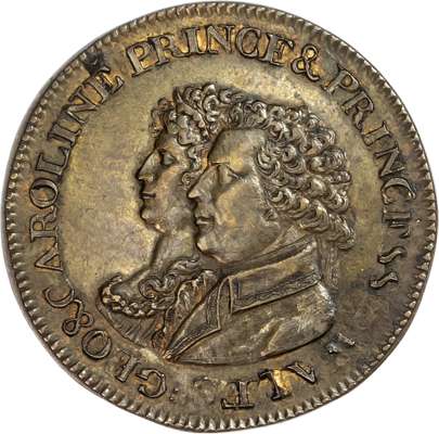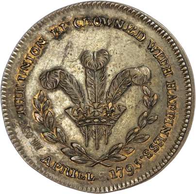 London National Series, Prince of Wales as Regent Halfpenny 1789, Draped bust left of prince, rev. crown, edge milled, 26mm/6.27gm. (DH 969). Another but silvered, 26mm/6.99gm. (DH 969). Another, brass marriage halfpenny/medalet 1793, Busts left of Caroline and George, rev. Prince of Wales plumes in olive wreath, edge plain, 26mm/4.56gm. (DH 976a). All about Extremely Fine, first nicely toned, second copper showing through on high points, third toned with some original lustre. [3]