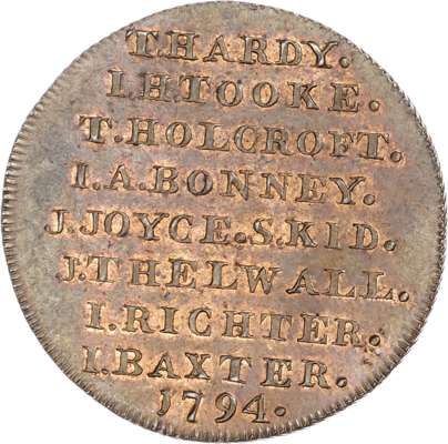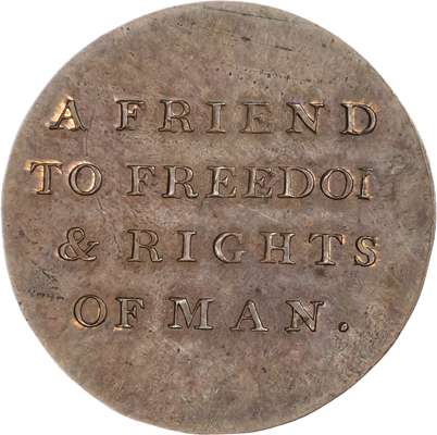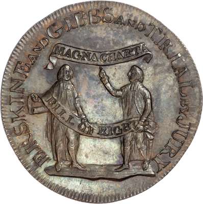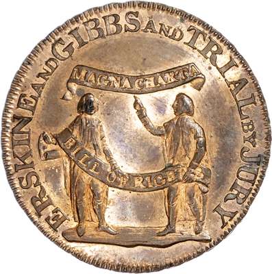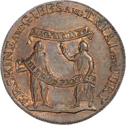 London, Political Series, Kempson’s Thomas Erskine Halfpenny undated, His bust left wearing a legal wig, rev. 4-line legend, edge plain, 29.5mm/7.92gm. (DH 1010). Another 1794, Two lawyers holding banners - ‘Magna Carta’ and ‘Bill of Rights’, rev, Jurors’ names in 9 lines edge engrailed, 29mm/9.33gm. (DH 1011). Another very similar but date in slightly diff. position, edge diagonally milled, 28.75mm/9.31gm. (DH 1012). Another but muled, rev. 5-line legend, edge plain, 28.75mm/9.31gm. (DH 1013). All good Extremely Fine, first toned with trace of lustre, second proof‑like with full lustre, third with a lot of lustre and fourth toned with beautiful iridescence - this last rare. [4]