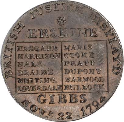 London, Political Series, John Horne-Tooke Halfpenny 1794, Draped bust, half facing right, rev. Erskine and Gibbs (his council) and list of jurors’ names in a box, edge PAYABLE AT LONDON LIVERPOOL OR BRISTOL, 28mm/8.99gm. (DH 1044a). Another with a plain edge but a Brockage, 27.5mm/8.3gm. (DH 1044), First good Extremely Fine, nicely toned with a hint of lustre, second approaching Extremely Fine and toned, unique. [2]