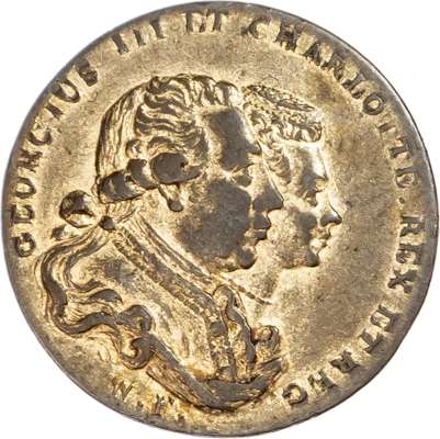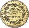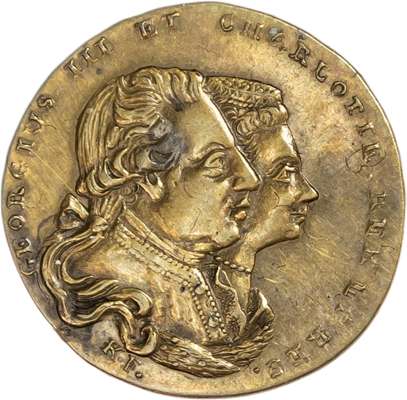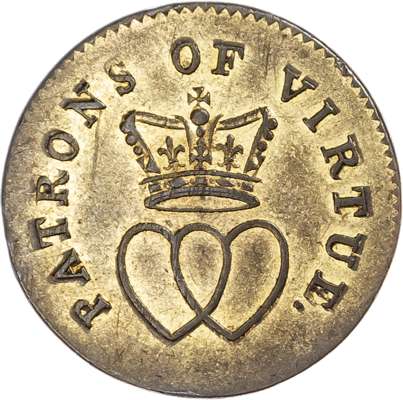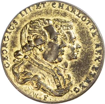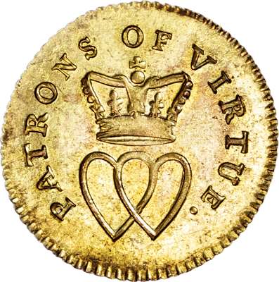 London, National Series, gilt Farthing 1796, Conjoined busts of George III & Charlotte. KF below, rev. Lyre and palm branch, edge plain, 20.75mm2.73gm. (DH 1133). Another, similar portraits but WF below, rev. ‘PATRONS OF VIRTUE’ in olive wreath, 21mm/2.88gm. (DH 1134). Another with same obv., rev. two crowned and conjoined hearts, 21mm/2.85gm. (DH 1137). Another but obv. and rev. similar, just slightly diff. styles, 21.5mm/2.43gm. (DH 1138). Another, not gilt with totally diff. conjoined busts, rev. crowned conjoined hearts, 19.75mm/2.35gm. (DH 1139). DH 1138 good Extremely Fine with good golden lustre, DH 1138 Extremely Fine toned, rest generally good Very Fine with gilding rubbing on high surfaces, last very rare ‘RR’, others generally rare. [5]