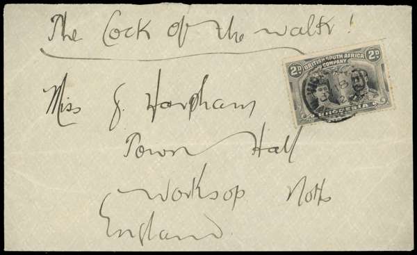 2d black and grey-black RSC D on envelope to Worksop, tied by Victoria Mashonaland SC of JY 18 12. The stamp from position 15, Thick Ear plate, King's eyebrow line and Queen's dark ear. Some creasing and the stamp with slightly stained perf tips