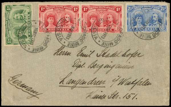 ½d, 1d pair and 2½d on envelope to Germany, Eldorado Mine DCs of 16 MAY 1913. Minor wear and creasing, an attractive three-colour franking