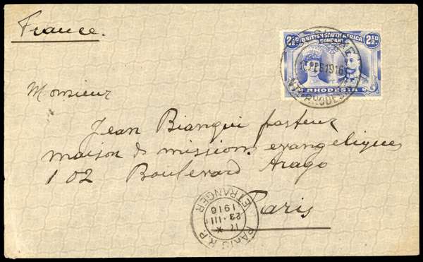 2½d ultramarine on envelope to Paris, Sesheke DC 15 FEB 1916. Livingstone and Paris backstamps, neat cover