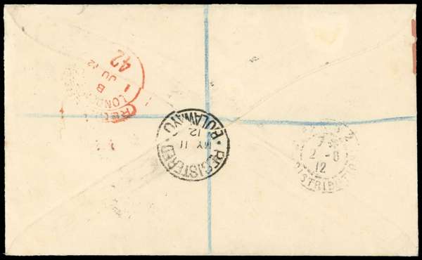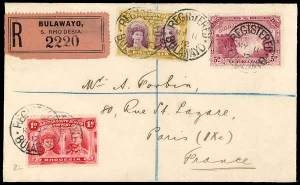3d magenta and yellow-ochre, 1d rose-red and 5d Falls on ‘Forbin’ registered envelope to Paris. Registered Bulawayo SCs of MY 11 12, appropriate backstamps. Neat