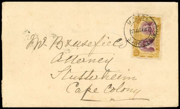 3d magenta and yellow-ochre, Short Gash plate, position 14 on envelope to Stutterfield, Cape Colony. Mazoe DC 17 AUG 1912, indistinct backstamp. Neat. SG 136