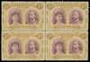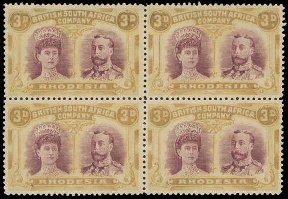 3d dull claret and ochre block, Thick Ear plate, positions 4-10. Large part o.g. with the lower pair unmounted, position 4 with Queen's cheek and King's temple flaw; believed to be a unique multiple from this printing. RSC D