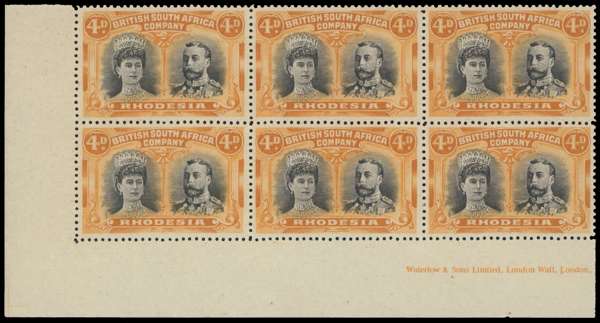 4d brown-purple and orange lower left corner block of six, Long Gash plate, positions 41-8. Large part o.g., lightly hinged on positions 41 and 43 only, a very fine multiple with large part imprint and position 46 King's extra curl. SG 139