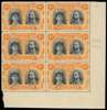 4d black and orange corner block of six, Long Gash plate, positions 34-50. Unmounted o.g. (odd tiny disturbance) and with a light vertical fold between the stamps, otherwise very fine. Positions 44 King's wisp and 50 nostril flaw. SG 140