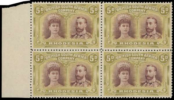 5d purple-brown and olive-yellow marginal block of four, Long Gash plate, positions 26-32. Fine o.g., with the left pair unmounted, position 26 button flaw. SG 141a