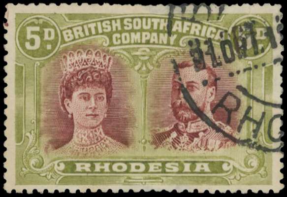5d lake-brown and green, Hook plate, position 13 printer's mark at upper left. Used, with part Bulawayo cds. Nice colour, some blunt perfs at top. SG 143a