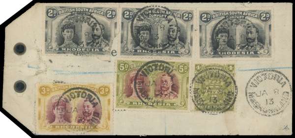 5d lake-brown and green, Hook plate, used on registered parcel tag to Worksop, along with three 2ds (one damaged), 3d and a 4d Arms. Each stamp with Victoria Mashonaland SC of JA 8 13. A wonderful franking, ideal for display. SG 143a