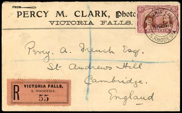 6d purple-brown and deep claret RSC H on registered envelope, from Victoria Falls to Cambridge