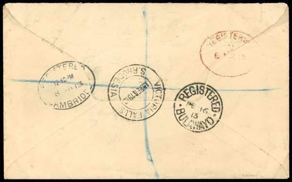 6d purple-brown and (purplish) deep claret, Thick Ear plate, on printed envelope to Cambridge. Victoria Falls DC of 15 FEB 1913. Bulawayo and London transits and Cambridge arrival on reverse. RSC H