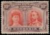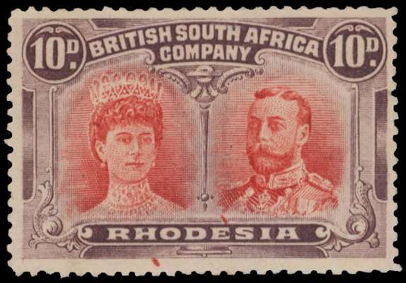 10d carmine-vermilion and deep purple, Thick Ear plate, position 26 ‘gouge’ beneath HO of RHODESIA, and button flaw. Part o.g., line down gum and a small, shallow thin at left, still a presentable example of this rare flaw. SG 150a, RSC D2