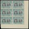 1s grey-black and deep turquoise-blue corner block of six, Long Gash plate, positions 39-50. Large part o.g. with positions 44-5 unmounted, the others lightly hinged; very fine except 44 has a surface fault by the King's right eye. Position 44 King's wisp (faint) and 50 nostril flaw. SG 151