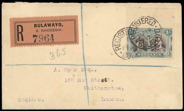1/- grey-black and deep blue-green on registered Dyer envelope to London, two Bulawayo SCs of AU 15 12. The stamp top marginal, position 2 long gash in Queen's ear. A very rare stamp on cover. SG 151