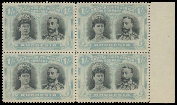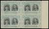 1s grey-black and pale turquoise-blue marginal block of four, No Gash plate, positions 29-35. Position 29 late state of club flaw, 30 dot outside top left corner and flaws left of King's curl, and 34 scratched ‘FR’. O.g., bend affecting upper pair, some gum disturbances; nevertheless a very scarce multiple, of fine appearance. RSC F