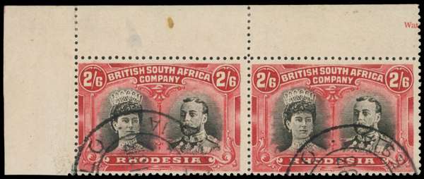 2s6d brownish black and deep rose-red corner pair with small part imprint, Hook plate, positions 1-2. Position 2 with (faint) hook in Queen's ear. Gwelo CTO (13 SEP) 13. The stamps with full gum, the selvedge with inclusion and thin. SG 155