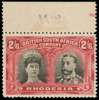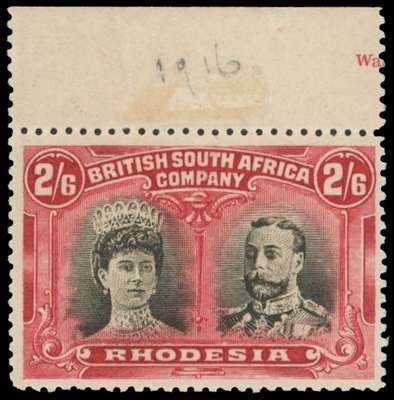 2s6d brownish black and carmine-red, Hook plate, position 2 hook in ear. Top marginal example with small part imprint, hinged on the selvedge only with the stamp unmounted; very fine. RSC A