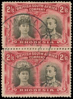 2s6d brownish black and carmine-red RSC A vertical pair, used at Umtali
