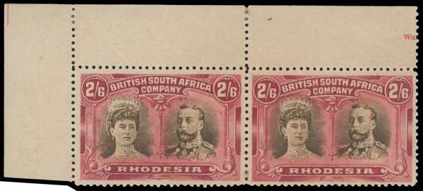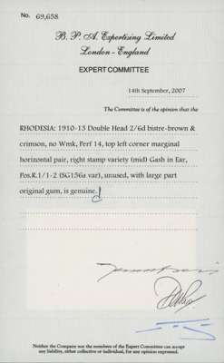 2s6d bistre-brown and crimson corner pair, Mid Gash plate, positions 1-2 with small part imprint. Position 2 with mid gash in Queen's ear. Large part o.g. BPA Certificate (2007). SG 156a
